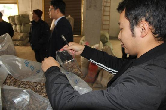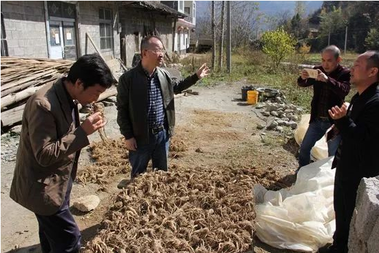 重庆市教委财务处处长刘宏伟(左二)、重庆希尔安药业总经理陈犁(左三)、重庆第二师范学院生物与化学工程学院院长兼书记周之良(右一)、天元乡党委书记杨文学(右二)、天元乡乡长杨成明(左一)等一行人先后到了象坪村、新田村、万村实地考察中药材生产基地和收存药材。