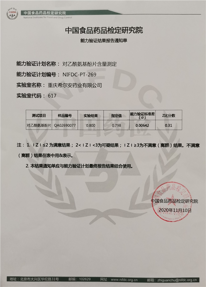 12月8日,希尔安药业质量管理部收到中国食品药品检定研究院寄发的能力验证结果报告通知单,在其组织的2020年能力验证中,公司质检中心参加的对乙酰氨基酚片含量测定(能力验证计划编号:NIFDC-PT269)获得“满意结果”!这是我司连续两年主动参与国家级能力验证并获得满意结果。
